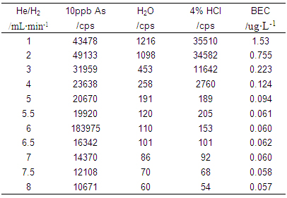 ÒÇÆ÷Ê×ÏÈÔÚ±ê׼ģʽϽøÐвÎÊýÓÅ»¯£¨ÀûÓÃ10¦Ìg¡¤L-1µÄLi¡¢Co¡¢In¡¢U¡¢Ceµ÷гҺ¶ÔÒÇÆ÷ÊÂÇé²ÎÊý½øÐе÷Àí£¬Ê¹ÒÇÆ÷ÁéÃô¶È¸ß£¬Í¬Ê±Ñõ»¯Îï¼°Ë«µçºÉ²úÂÊСÓÚ3%£©£»ÔÙ¿ªÆôHe/H2Åöײ·´Ó¦Æø£¬Öð²½Ôö´óHe/H2Á÷Á¿£¬²âÊÔ³¬´¿Ë®¡¢4%HCl¼°10¦Ìg¡¤L-1 As£¨4%HCl½éÖÊ£©ÔÚ75amu´¦µÄÏìÓ¦Ðźţ¬ÅÌËãÆäÅä¾°µÈЧŨ¶È£¨ÏêϸÊý¾Ý¼û±í1¼°Í¼1£©£»²¢ÀûÓÃAs±êÒº½øÒ»²½ÓÅ»¯He/H2Á÷Á¿£¬»ñµÃÒÇÆ÷ÊÂÇé²ÎÊýÈç±í2Ëùʾ¡£